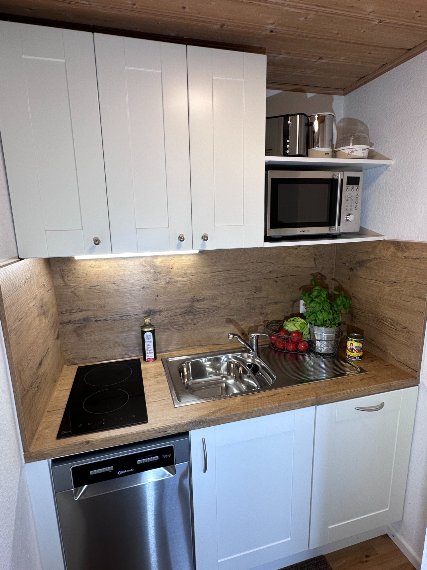 - Küche: Kaffeemaschine, Geschirrspüler, Kühlschrank mit Gefrierfach, Radio (Kasette + CD), Wasserkocher und Toaster